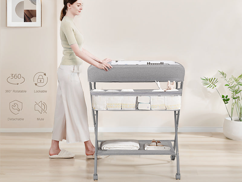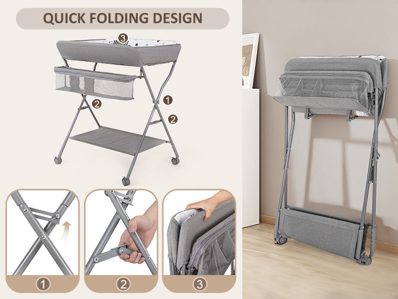 Easy Mobility: The compact portable diaper station features 4 lockable mute universal wheels, making it easy to move on rough ground and plush carpets silently. Simplify your baby care routine with our convenient and portable design.
